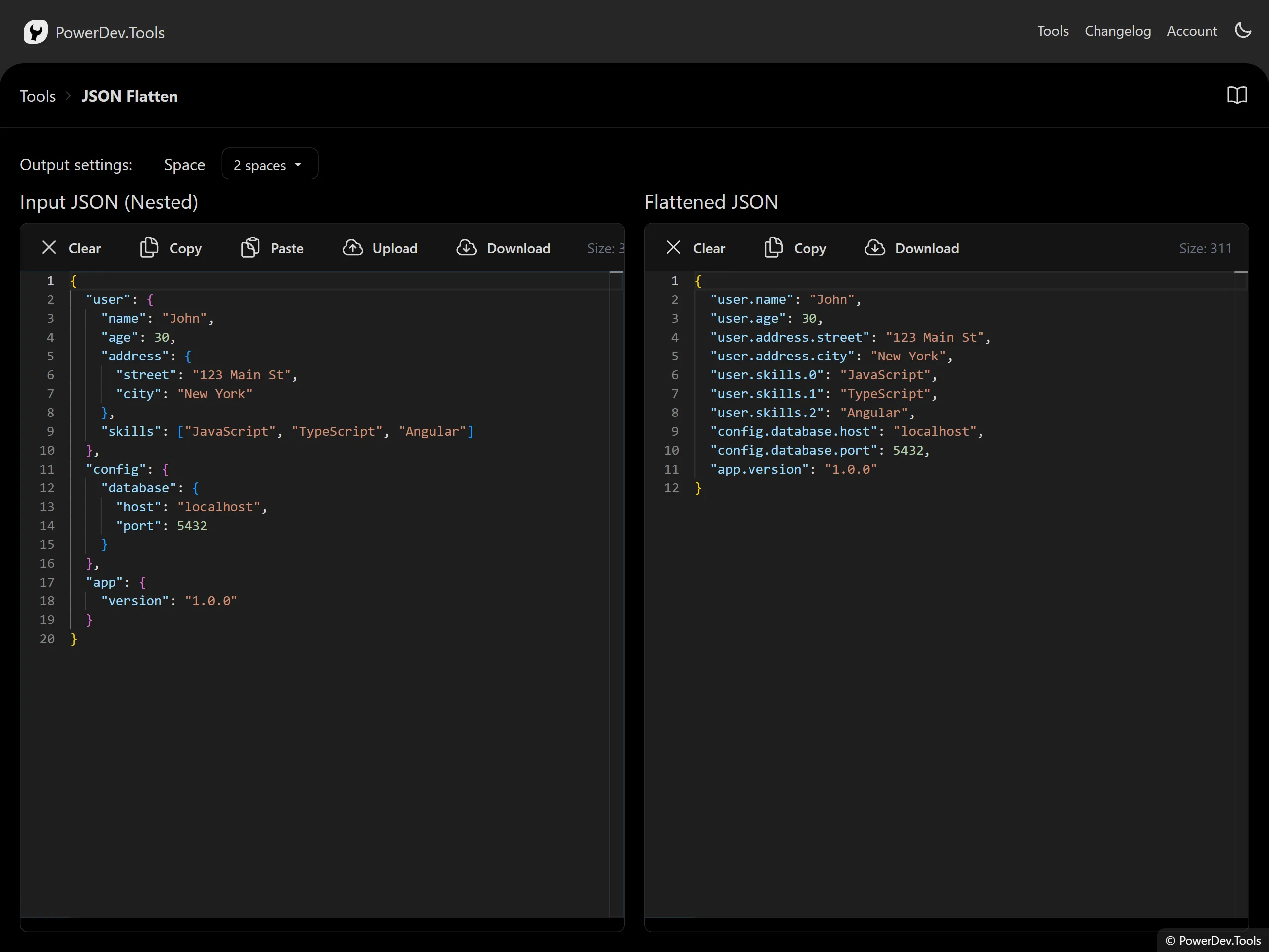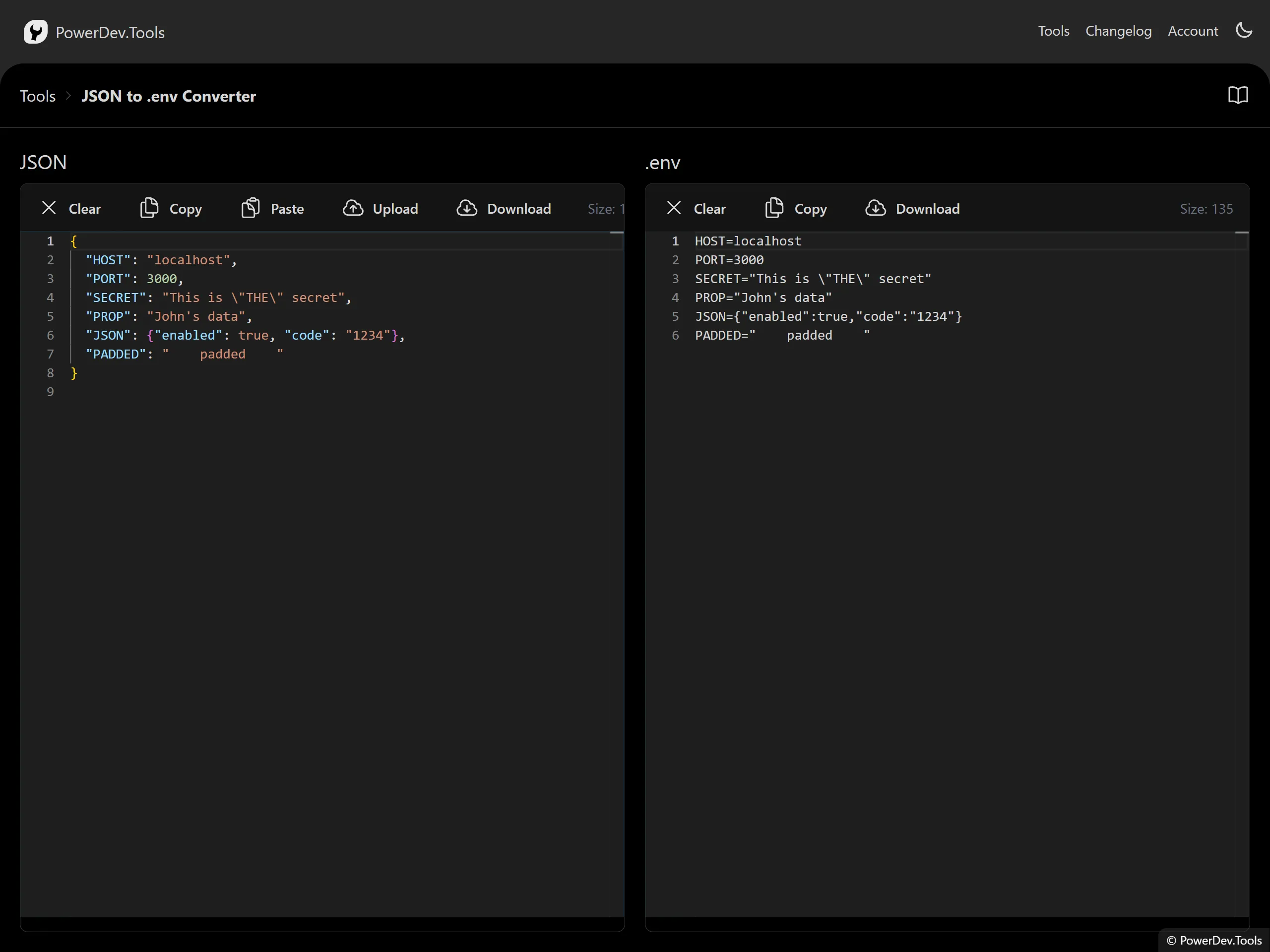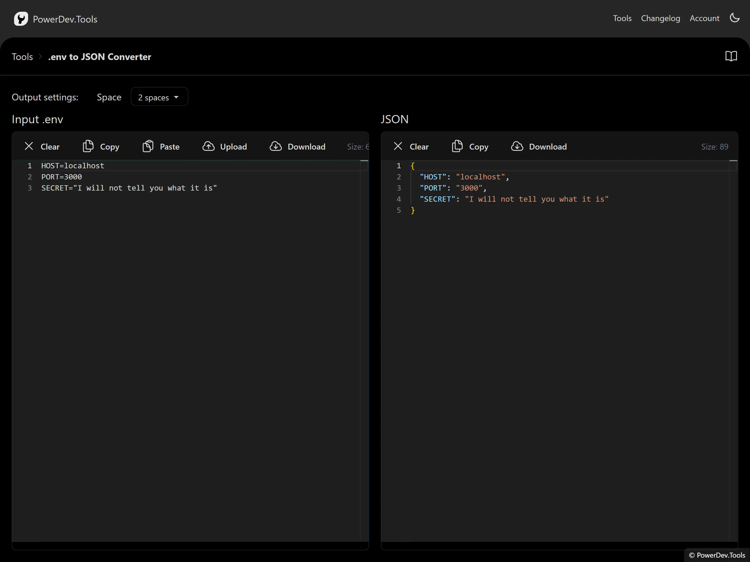 .env to JSON ConverterAngular PWA Icon GeneratorBase64 Encoder/DecoderBcrypt Hash GeneratorBcrypt Hash ValidatorColor Contrast CheckerColor Contrast ValidatorColor Palette GeneratorColor Swatch GeneratorDate and Timestamp ConverterHash GeneratorHTML Entities Encoder/DecoderImage to Data URLJSON FlattenJSON FormatterJSON SanitizerJSON to .env ConverterJSON to TOML ConverterJSON to YAML ConverterJSON UnflattenJWT DecoderJWT Secret GeneratorLaTeX Formula to UnicodeLorem Ipsum GeneratorNanoID GeneratorNumeronym GeneratorPDF GeneratorPDF Merge / SplitPDF Page SplitterPDF To CSVPDF To TextQR Code GeneratorQuoted Printable Encoder/DecoderReact Native SVG ConverterRoman Numeral ConverterString ProcessorSVG to React ComponentText ObfuscatorText StatisticsText to NATO AlphabetTOML FormatterTOML to JSON ConverterTOML to YAML ConverterULID GeneratorURI Encoder/DecoderURL ParserUUID GeneratorWiFi QR Code GeneratorYAML FormatterYAML to JSON ConverterYAML to TOML Converter